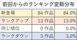2か月前ということもあり、大半の作品が前回ランクインしていない作品でした。