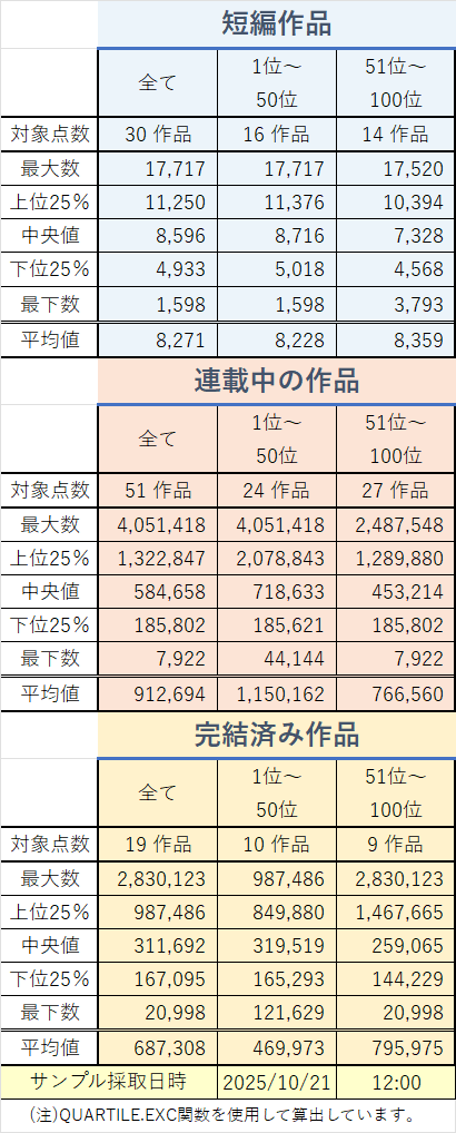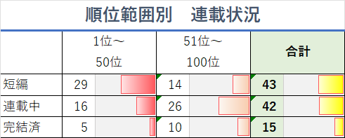 以上の通りです。完結済み作品は前回とそれほど変化ありませんでしたが、短編作品が大きく数を増やし、短編と連載中の作品が同数程度になっています。