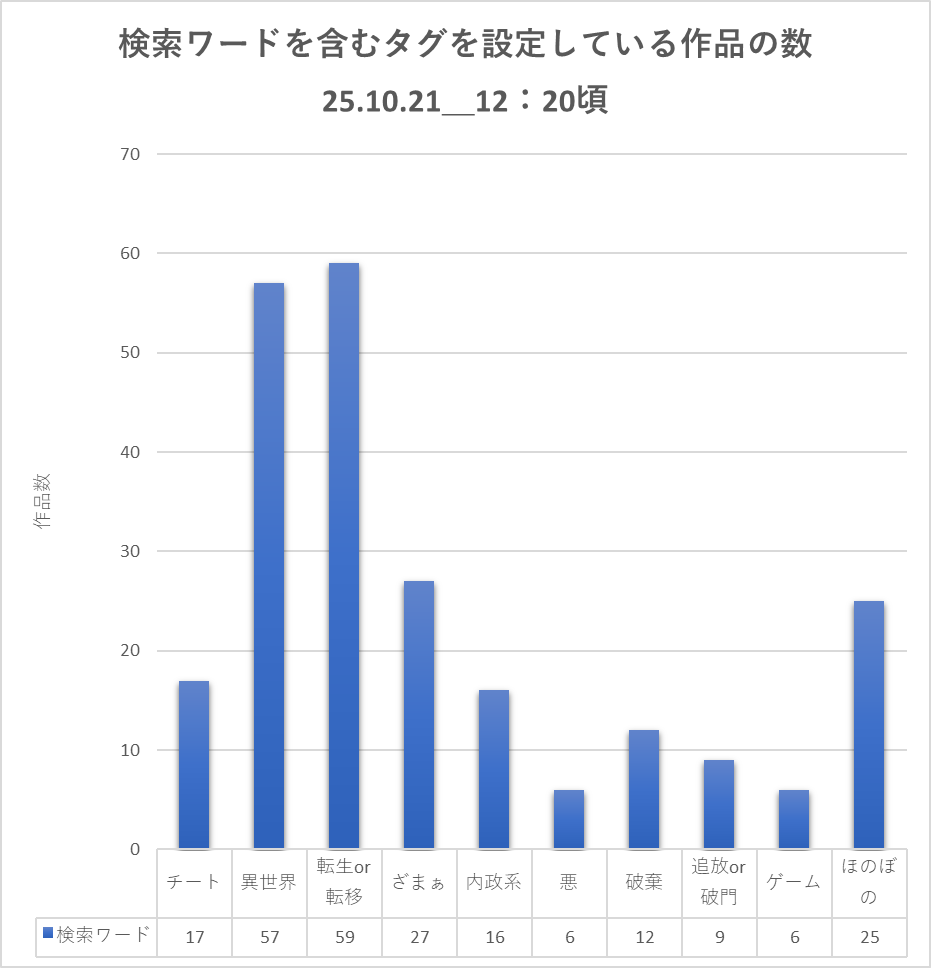- 具体的なざまぁの内容を示す「クソボケざまぁ」「微ざまぁ」といったバリエーションのタグも見られ、読者の間で「ざまぁ」のシチュエーションに対するニーズが細分化している可能性があります。